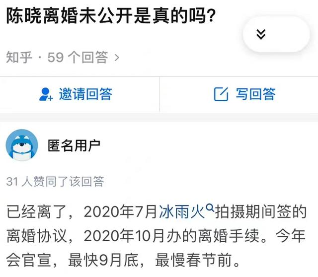 北京时间8月28日,有匿名网友在某社交平台爆料,说陈晓和陈妍希在2020年7月拍冰雨火期间,曾经签了一个离婚协议,到了2020年的时候办了离婚的手续,而发这一消息的人还信誓旦旦的表示,两人在今年就会官宣离婚,最快是在9月底,最慢是在春节之前。