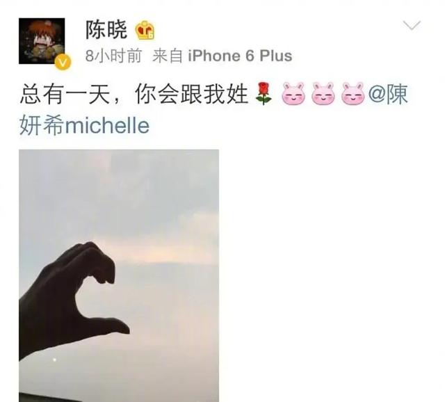 看到这一幕之后,陈妍希和陈晓两人的关系再也瞒不住了,于是陈晓很有担当的在网络上晒出一张照片,照片上他对着天空比了一个心,配上一条浪漫的官宣文案,一切都水到渠成。