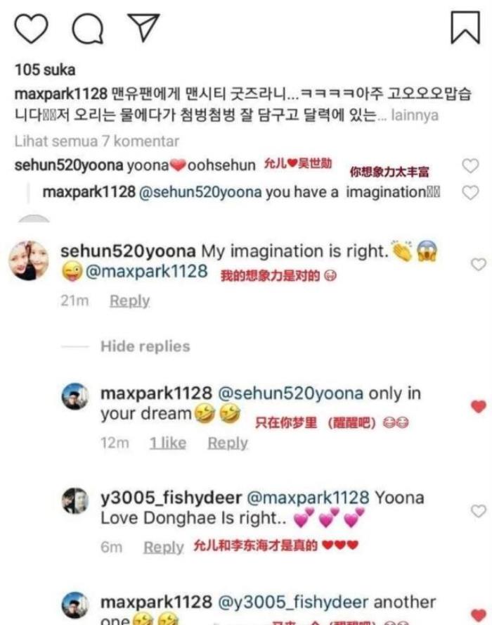 然后呢,总有些cp粉不分场合的yy,而经纪人也是下场回怼,称对方想象力太丰富了。而魔幻的是,这位cp粉还回复了说自己的想象是对的。继而,又有另外一个cp粉也加入阵营,称李东海和允儿才是真的。这……是看不懂英文吗?
