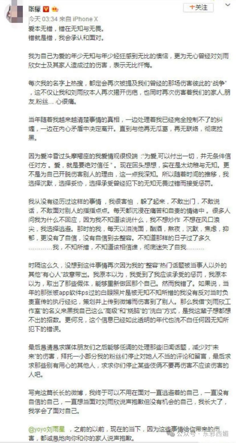 张檬收获了刘雨欣发出的宽恕文后,秒删道歉。两年后她上综艺试水复出,又发微博道歉再炒一把,同时贴上了刘雨欣那篇文字。