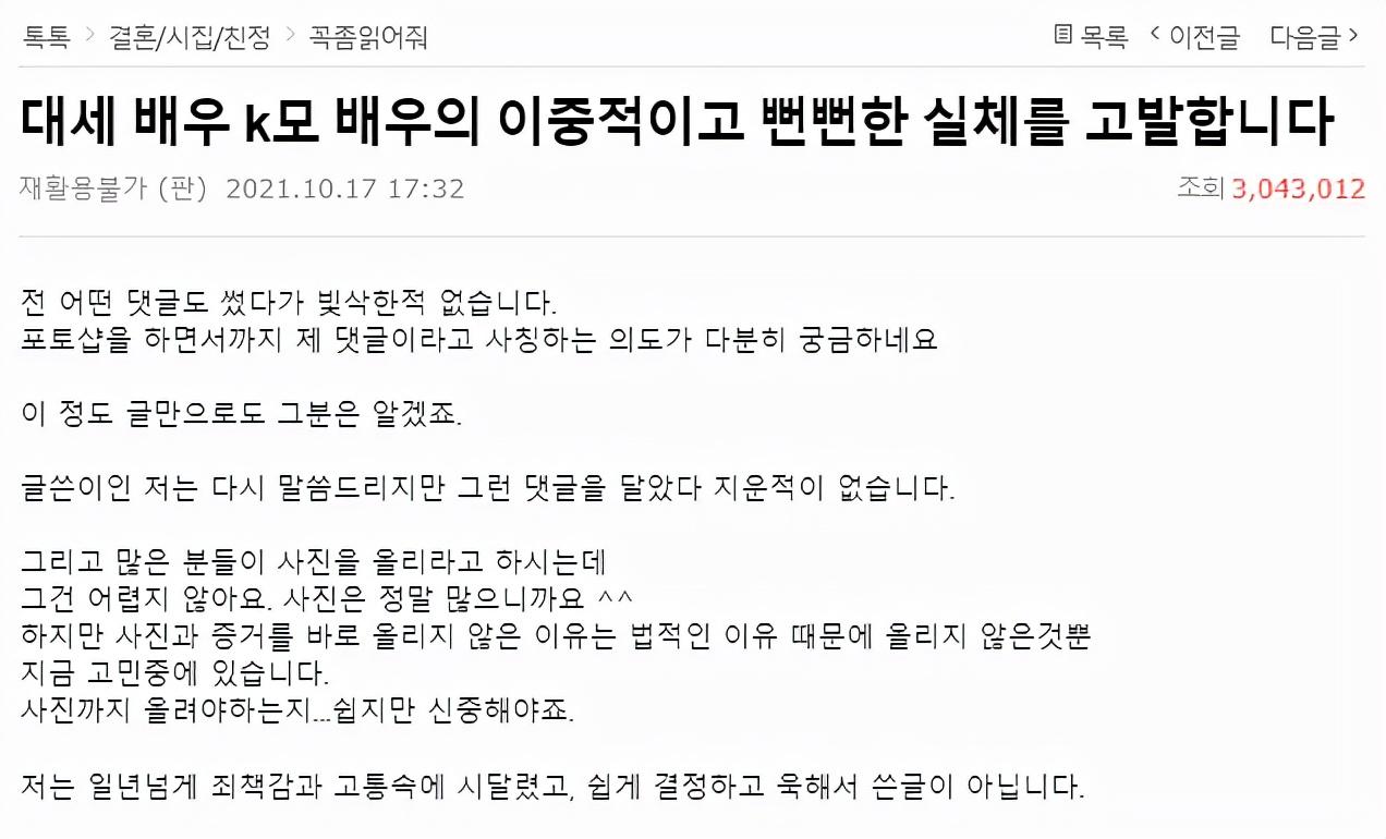 这个帖子一出,不夸张地说整个韩国互联网都震动了,不只是娱乐八卦区,甚至还登上了社会版的热门,人们纷纷在猜,帖子里这个男演员到底是谁。