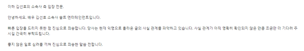 到最开始的帖子发出大约两天后,金宣虎经纪公司的声明才姗姗来迟,而且并没有给出任何明确的回答。