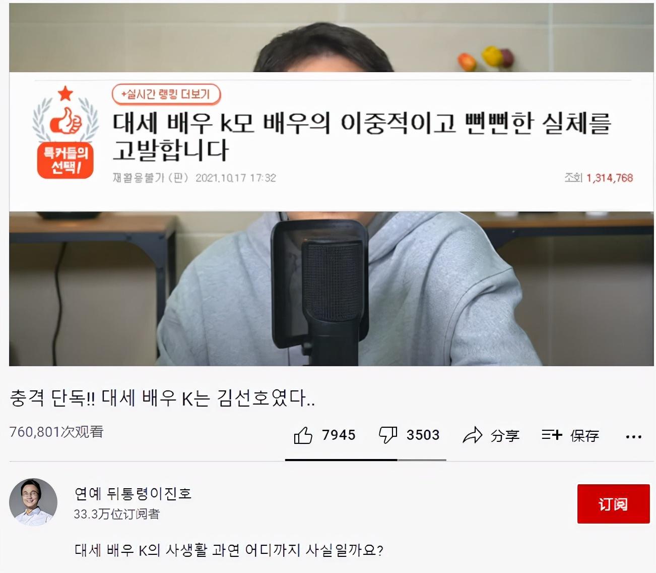 但网友为什么会觉得就是金宣虎呢?除了文中的时间线推理和一些诸如“戏剧演员”之类的细节之外,还有就是娱乐记者李振浩一个直接指名道姓的视频直播。