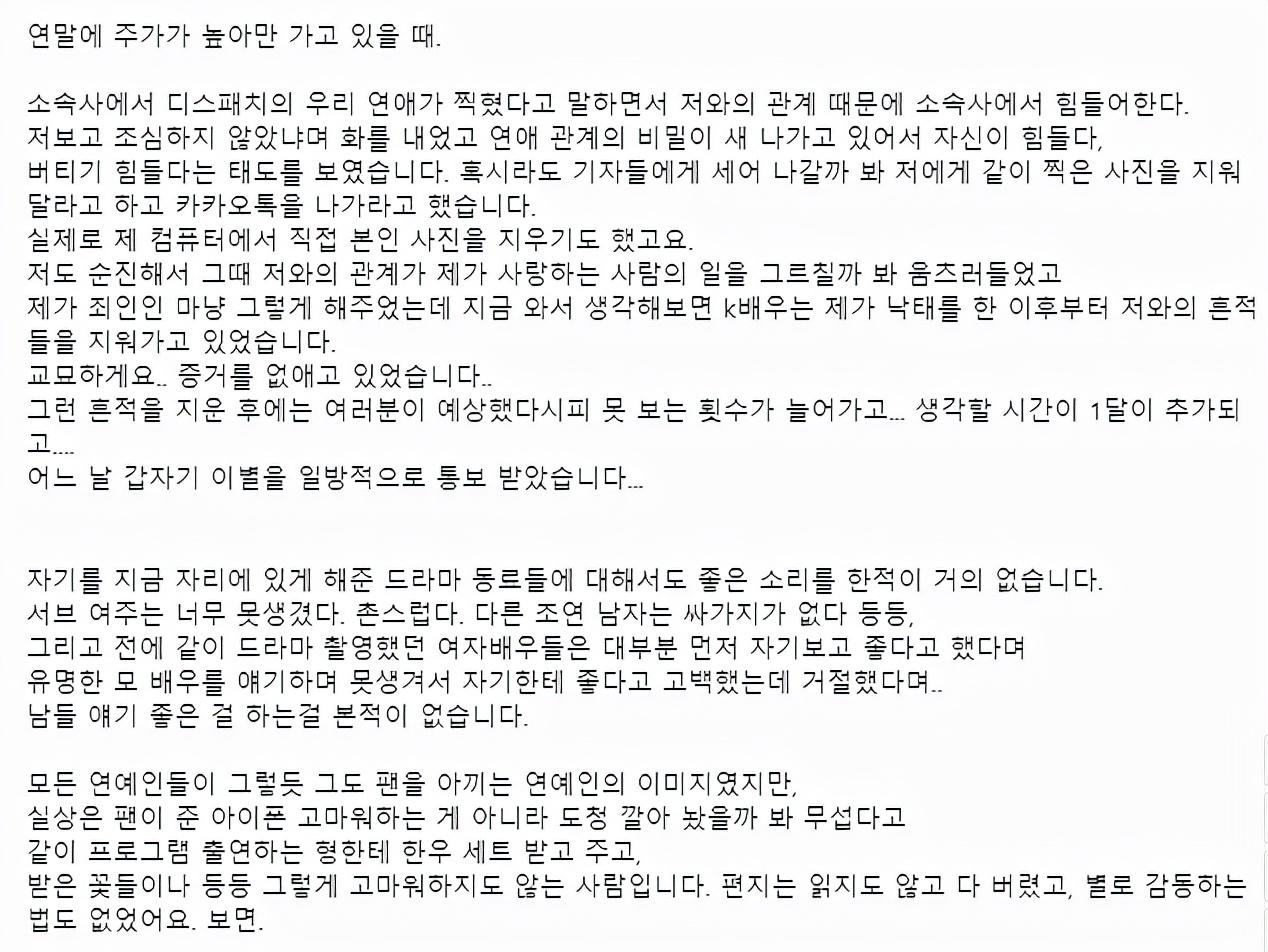 在文章中,这位发帖人声泪俱下地控诉了K演员对她做出的种种残忍行径,“人人以为他善良,其实根本就是个毫无良心和罪恶感的垃圾”。