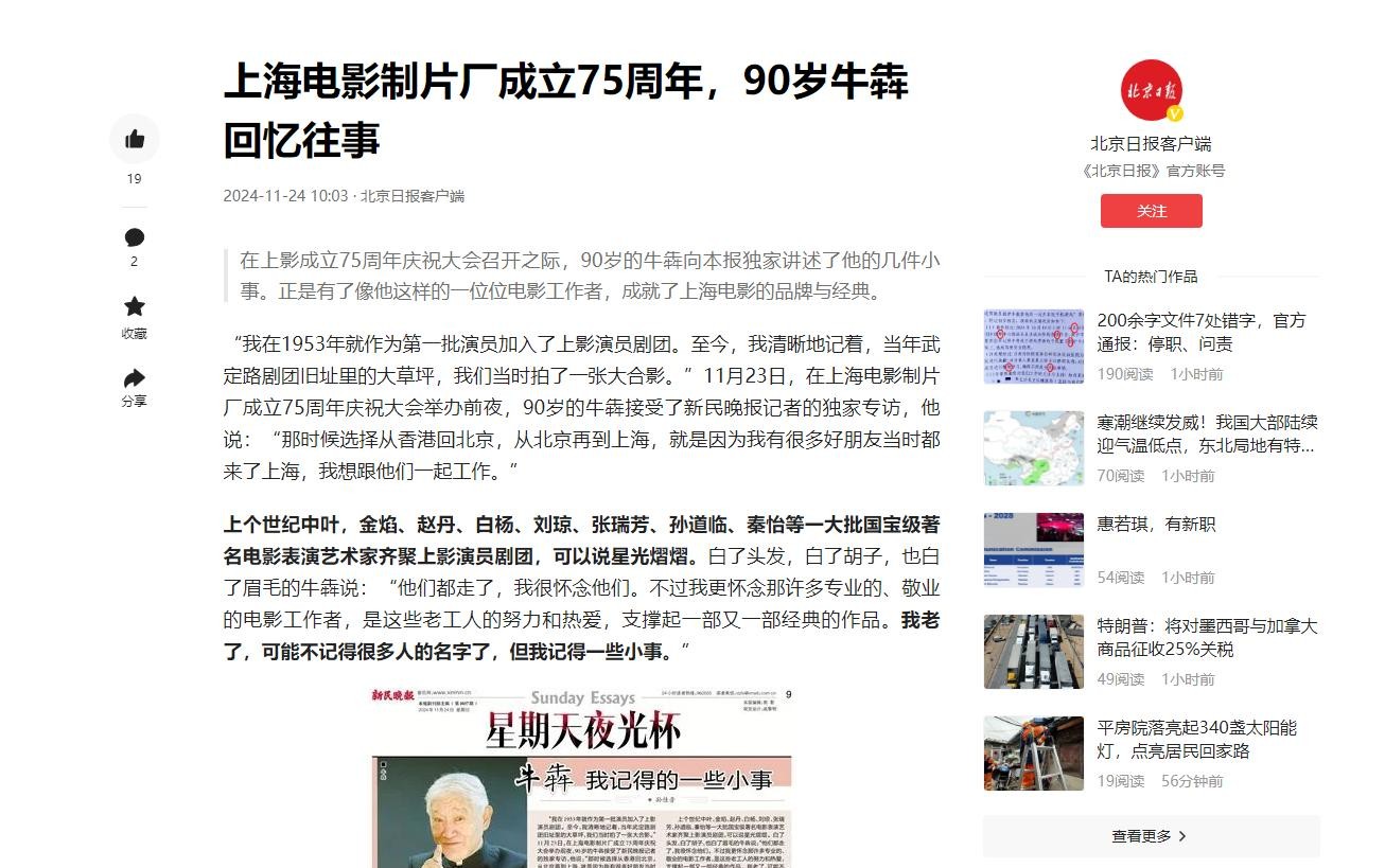 上海电影制片厂成立75周年,90岁牛犇回忆往事 2024-11-24 10:03·北京日报客户端