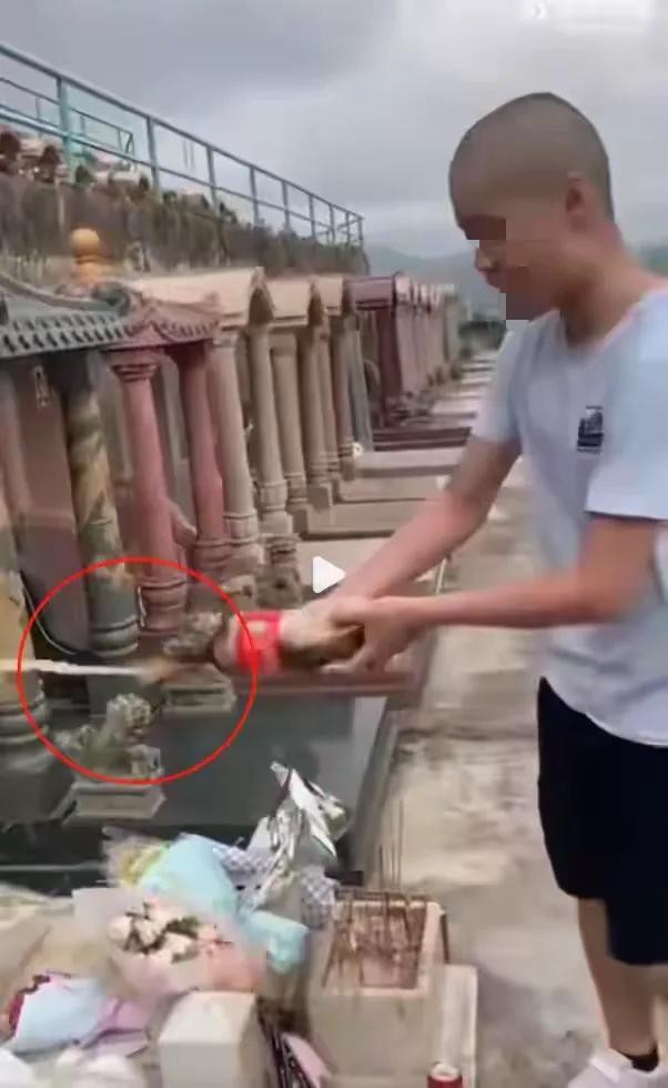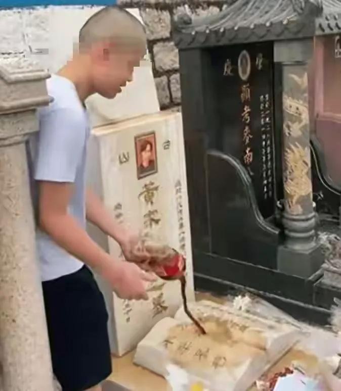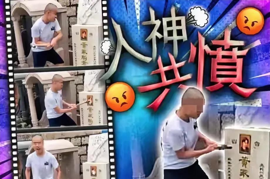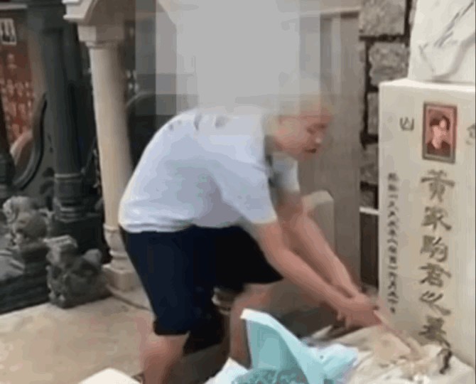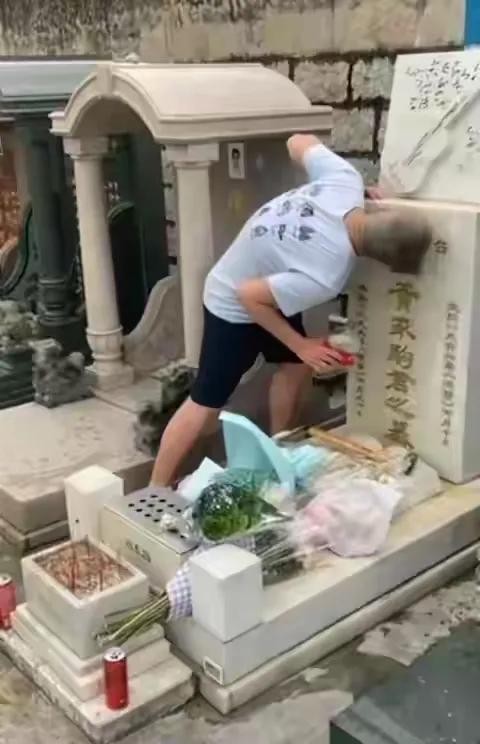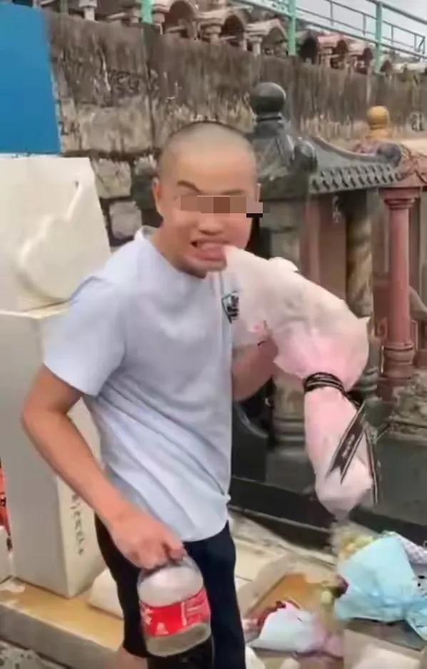 该男子的行为之恶劣,不仅破坏了墓碑,还变态到亲吻墓碑上的遗照!