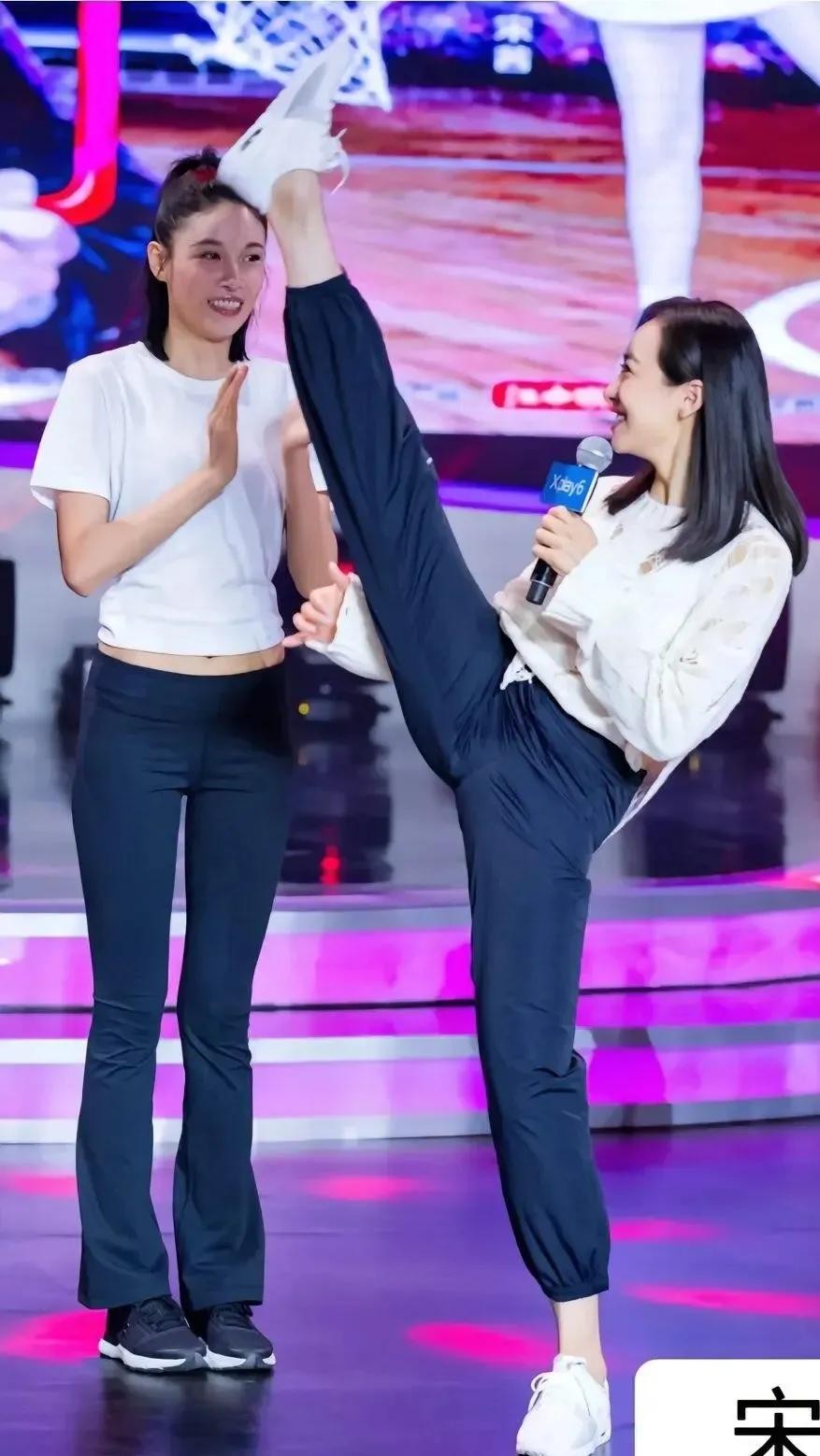 宋茜这动作,轻而易举就做到了,脸不红心不跳气不喘,手里还拿着话筒。这是舞蹈和武术不分家了。