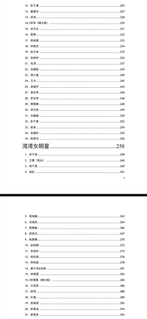 明星421页是一个PDF文档,里面记载着各种娱乐圈明星八卦的合集。该PDF文档一共421页,其目录包括:四旦双冰记、老家伙系列、老花系列、小花系列、港澳台男明星系列、港澳台女明星系列、老生系列、小生系列、惯三系列、子不语怪力乱神系列等。