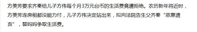 2001年,方美芳带着孩子方伟状告齐秦没有按时给孩子抚养费,要求齐秦一次性给付1500万台币。