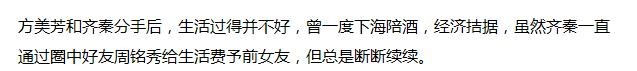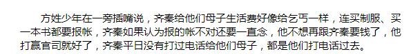 据方美芳所言,在这十四年内,齐秦虽然也会给他们母子二人生活费,但也总是断断续续,而自己带着孩子也没办法全身心投入到工作之中,因此,也总是干一些零碎的杂活,收入很少。