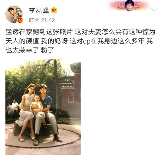 小编查阅发现网络上关于李易峰家庭的具体信息很少,只是有一些家庭合照。去年12月中旬,李易峰晒出了一家三口童年合照。在配文中,李易峰形容父母年轻时候的颜值是惊为天人,叫父母为“这对CP”,自己很幸运,要成为粉丝了。