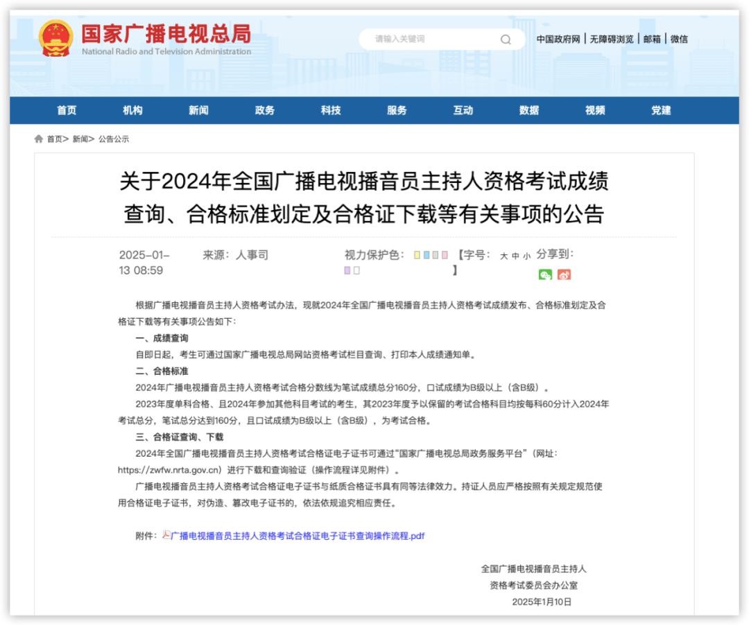 2024年播音员主持人资格考试成绩查询、合格标准划定公告来了!