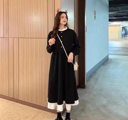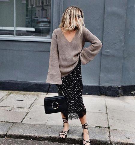 3:拼接色调的毛衣层次感极强,镂空粗毛线风格也是目前毛衣的流行样式,巧妙搭配黑色蕾丝长裙可以转移注意力,让胖女生整体看起来比例更加协调。