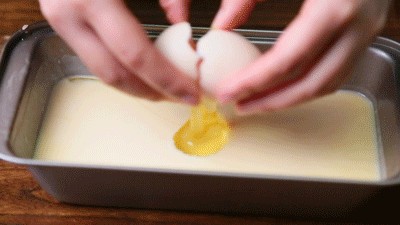 豆妈的这个方子用两个鸡蛋就够了,一个打散用来调和面糊,还有一个就直接打在面糊上,进烤箱烤,这就是这款鸡蛋糕的特色之处。烤的时间长,鸡蛋更凝固,如果想吃溏心蛋就要记得缩减时间,十二分钟左右就够了。