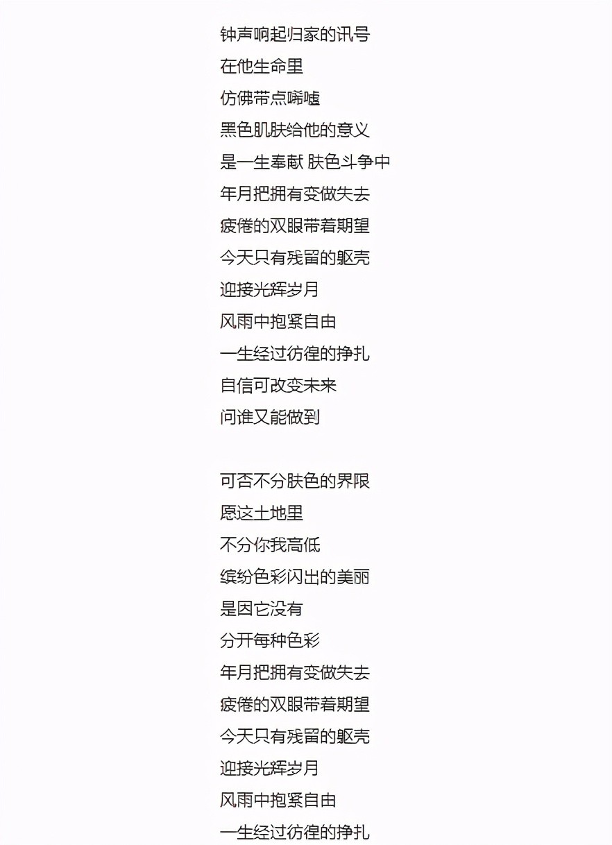 "......一生经过彷徨的挣扎,自信可改变未来,问谁又能做到,今天只有残留的躯壳,迎接光辉岁月,风雨中紧抱自由......"