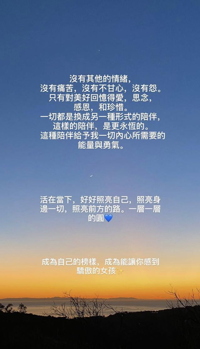 或许是Bella怕被人误会,Bella便在即时动态中发文表示:没有其他的情绪,没有痛苦,没有不甘心,没有怨。只有对美好回忆的爱和思念,感恩和珍惜。一切都是换成另一种形式的陪伴,这样的陪伴,是更永恒的。这种陪伴给予我一切内心所需要的能量和勇气。