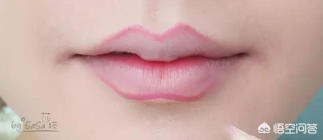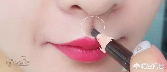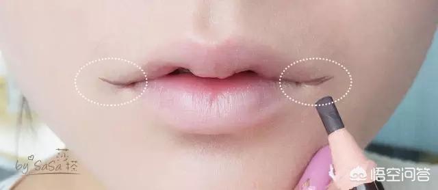 (用跟口红颜色相同或浅一点的唇线笔画出虚线 再进行填色)