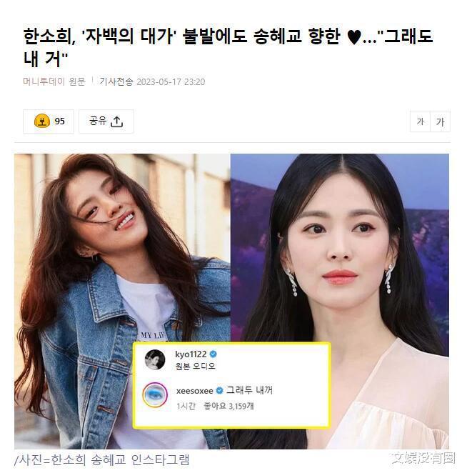 据韩国媒体报道:本月 17 日,韩素希在宋慧乔最近发布的 SNS 动态中留言说 " 即使这样,还是我的。"