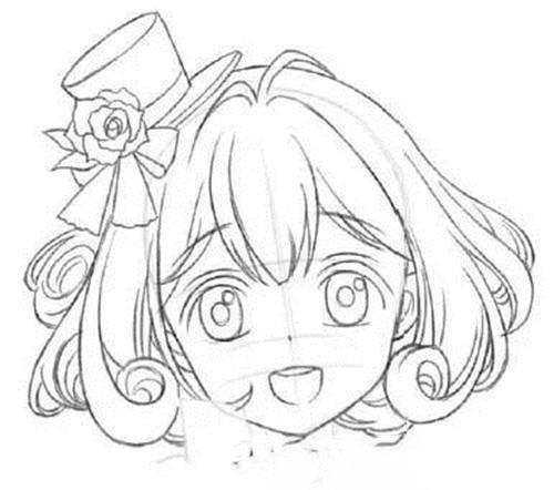 3,接下来开始画型轮廓。绘制两鬓的头发线稿。并完成帽子等发饰的线稿。