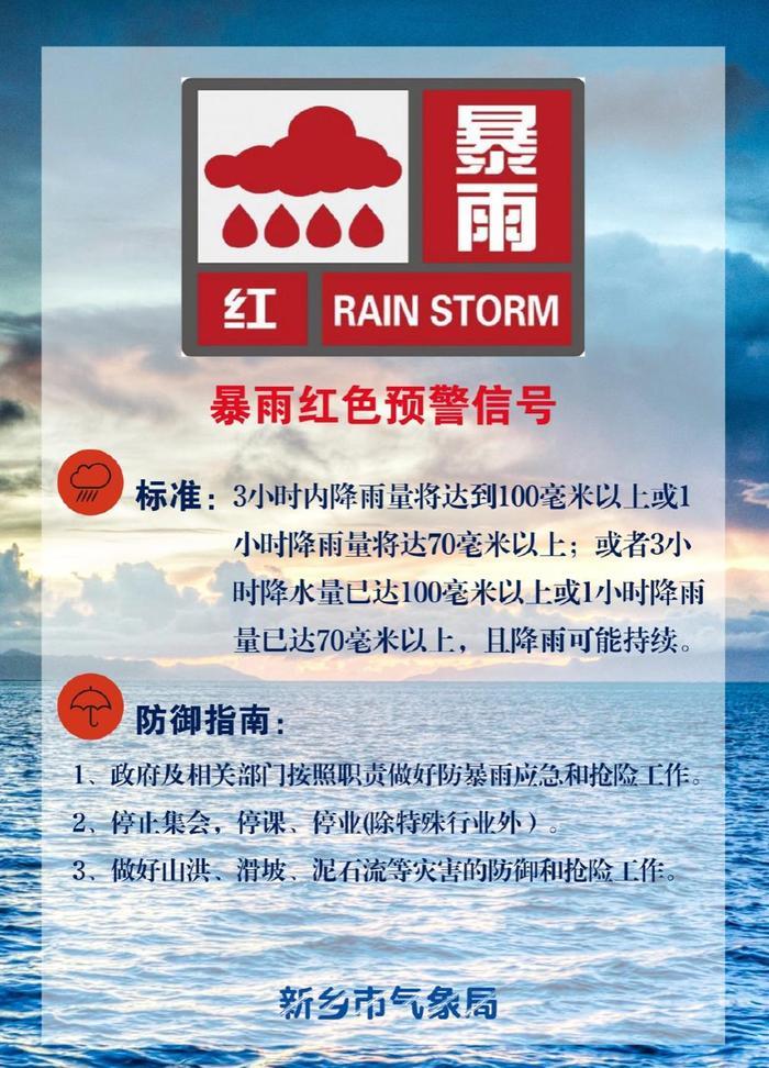 22日4时30分,新乡市气象台继续发布暴雨红色预警信号:预计未来3小时内,新乡全区强降水持续,累计降水量将达100毫米以上。
