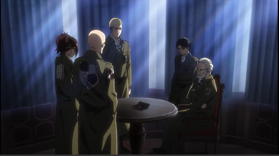 第十二集一开始,墙内的高层领导们正在讨论关于肯尼的遗物,那一份可以变成巨人的针剂。针剂里含有人的脊髓液,凭借墙内如今的技术无法解析。为了避免浪费针剂,高层决定把针剂交由利威尔保管,由利威尔做出选择。