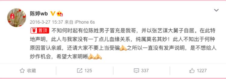 记者注意到,陈婷的微博置顶为一条说明“陈姓男子冒充是我哥”的微博,该微博称“不知何时起有位陈姓男子冒充是我哥,并以张艺谋大舅子自居”,并声明,“此人与我家没有一丁点儿血缘关系,纯属莫名其妙!此人不知出于何种原因冒认亲戚,还请大家不要上当受骗,之所以一直没有发声说明,是不想给人炒作机会,希望大家明晰。”该条微博于2016年3月27日发表。