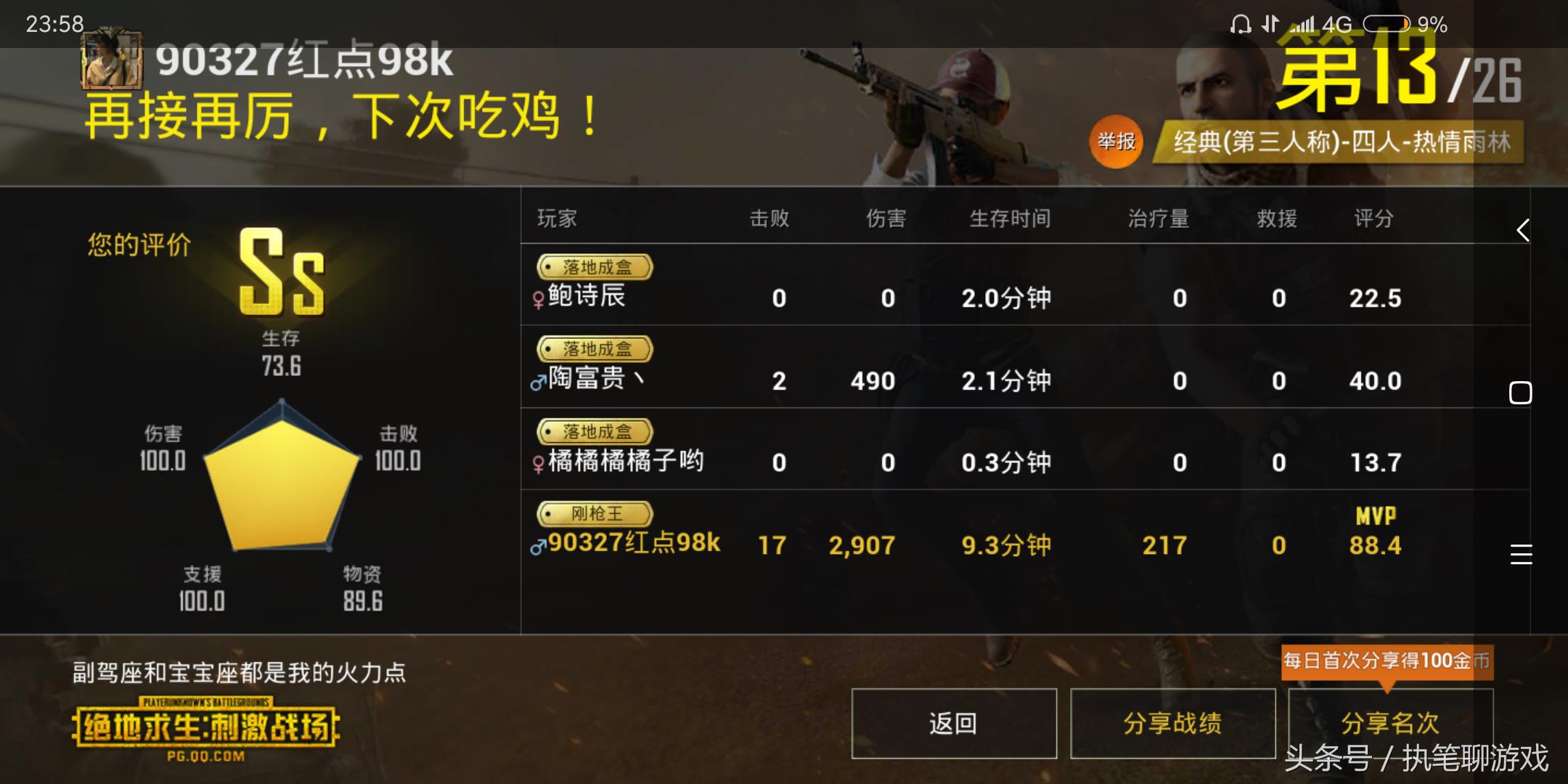 刚才说到的“枪神”来了~这位“枪神”落地9分钟完成17杀~他告诉我,之所以有这么好的战绩,源于他喜欢跳一些“特殊”的地点~这些地点落地之后,就会有很多人....上图中的17杀,就是跳伞落在了天堂度假村!其实呢,每张地图都有一些地方只有“枪神”才敢去,比如沙漠地图的皮卡多,海岛地图的军事基地....好吧,反正游戏君也去过无数次,但是几乎没有“活着出来过”....各位大佬们,可曾有这方面的体验呢?嘿~