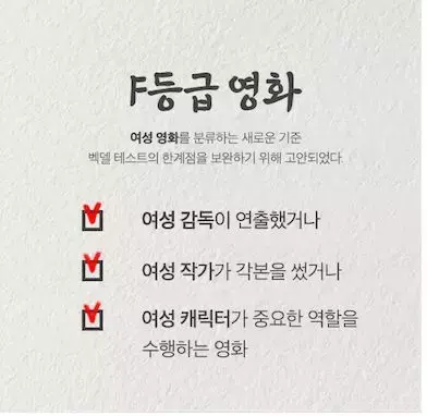 但遗憾的是,在男性为中心的电影界,F等级的女性电影屈指可数。即便是电影中有女性登场,角色也仅限于帮助男性或者是受害者、无业人员、妻子等。