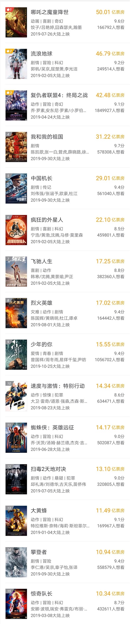 2019年票房10亿以上的电影只有这15部