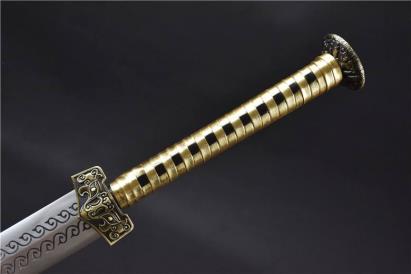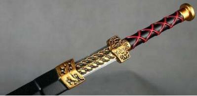 青釭剑在《三国演义》中和所有宝剑一样被形容为“削铁如泥”,它的来历不凡,据小道消息称这柄剑是曹操偷盗梁孝王刘武的墓时在墓中遇到的一头‘青眼狻猊’所化。此剑剑首为竖环状,其内有龙首相交纹饰,剑身有蟠龙纹,其上刻有‘青釭’两字,剑鞘为黑漆金龙纹,拔剑有龙吟之声,可裂金碎铁,曹操得之大喜。(在这里顺便提一下,曹操的另一把剑倚天剑是汉献帝在曹操出征讨伐袁术之时赐给他的,可以代表天子亲临,按道理讲应该叫‘天子剑’)