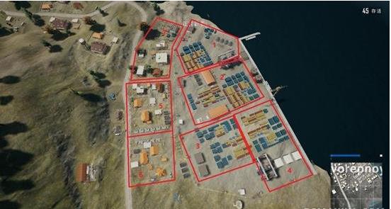 按照资源刷新率将P港分为如图五个区域。其中区域一是最佳的落点,这里资源最丰富,三个大仓能让你落地就有战斗力,同时这里也是竞争最激烈的地方,一定要做好落地刚枪的准备;区域二是沿路的一排房子,资源也是相当丰厚,红色餐厅就位于这一区域,强烈建议搜完区域一直接搜索区域二,把P港资源最丰富的两个区域占领下来。区域三和区域五资源中上,因为有数量可观的双层高楼以及假车库,所以资源还是有一定的保障;区域四则较为鸡肋,资源偏下,很多时候时间紧急,小编都是直接放弃这里。