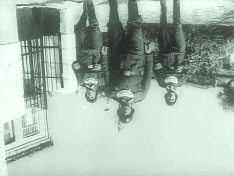 然后在这个倒立的镜头里,出现了德军倒立的镜头,无形中,电影通过这种违背正常规律的视觉画面,带来一种不和谐与不平衡的压力,渲染了一种缘起于全副武装的德军带来的高度紧张。