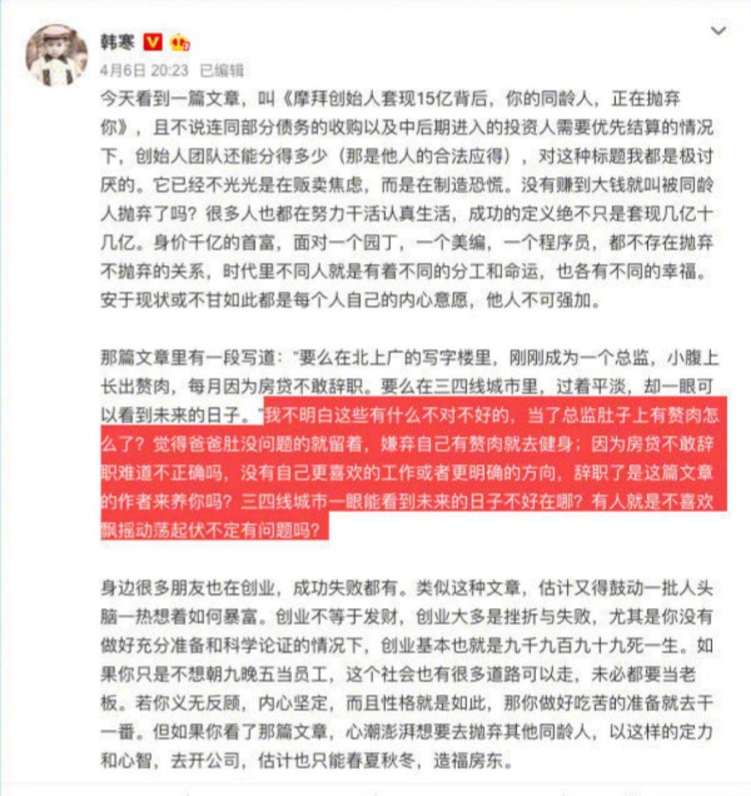 韩寒直指该文在贩卖焦虑,制造恐慌