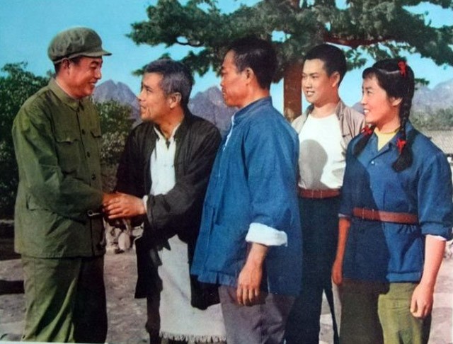 3、青松岭生产大队大队长周成向张万山等介绍公社新派来的代理支部书记方纪云(朱广龙饰)。张万山热情的和老方握手。