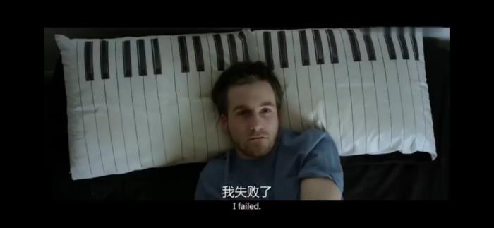主角仰面而躺的枕头是两个黑白钢琴键拼凑在一起的,此时因为主角位于两个枕头中心位置,所以给我们的感觉是一个完整的钢琴键盘。键盘枕头呈倾斜线条,而当主角侧身之时,枕头钢琴琴键分裂两半。此处的“倾斜”和“分裂”都展示了此刻主角内心的状态,表现出钢琴比赛失败对他的重创。