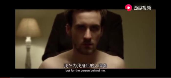 特写2:调音师身体部位的特写,包括裸露的腿部和腰部、局部特写,裸露的肩膀和面部特写。这里面的弹琴时不合常理的“裸露”都在观众心理设下一层悬念。