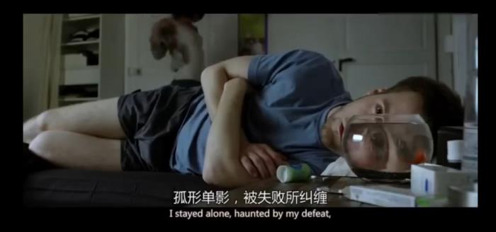 下一场景直接出现的是主角躺在家中的床上的中近景镜头,同样是俯拍的视角,而主角从位于画面中央中心对称的位置,转向右侧的侧身方位。这个场景的布景构图也别出心裁。