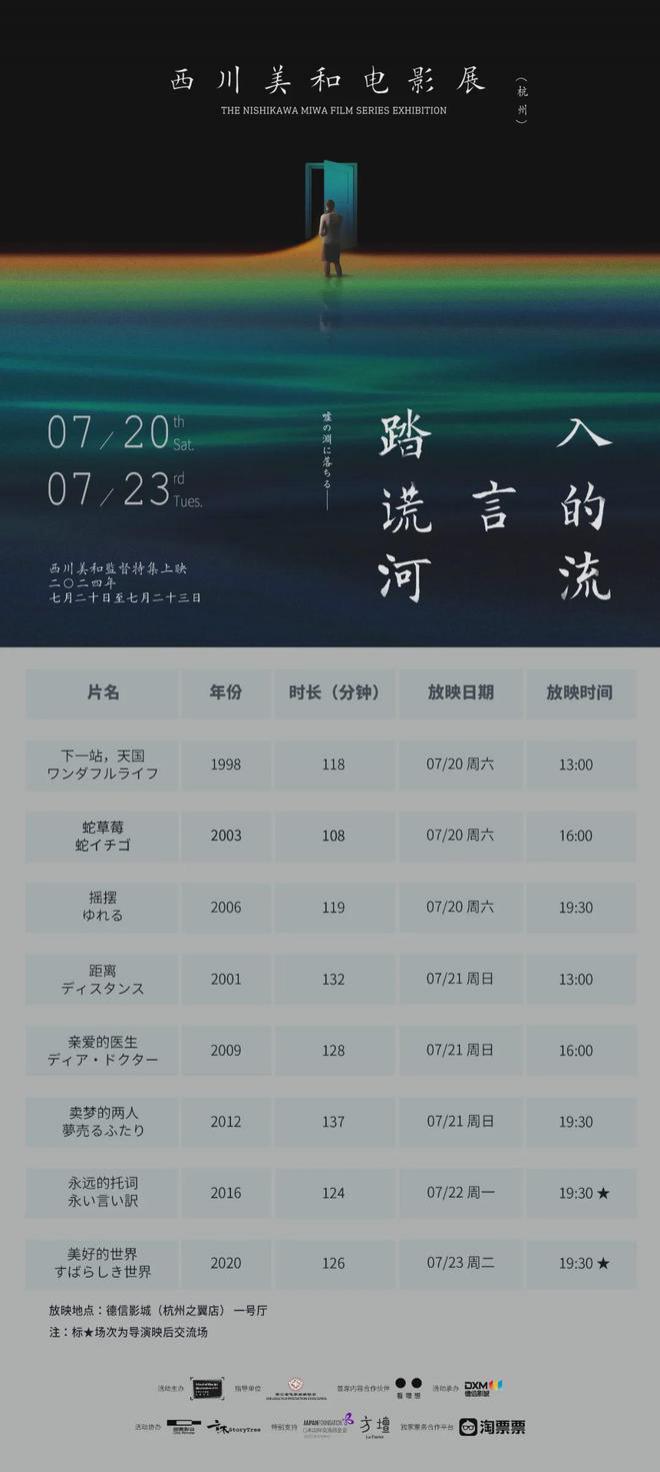 2024 年 7 月 20 日至 23 日,在浙江省电影放映协会的特别指导支持下,中国美术学院电影学院将主办,德信影城杭州之翼店承办,国美影业协办西川美和电影展杭州站,西川美和导演将出席《永远的托词》《美好的世界》两部影片映后环节,与影迷朋友进行深度交流。