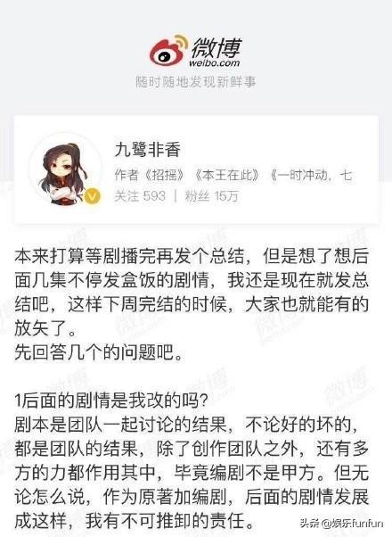 九鹭非香表示,剧本是团队讨论的结果,见到网友扬言要寄刀片,觉得对不起大家、能力不够。她透露剧本当初定下40集,并为此补充大量情节,但是某天接到通知剧本要大调,包括「鬼魂」、「烧纸」不能使用,因此重新调整架构,原作小说的内容从24集扩充到40集,还被要求撑到50多集,长文感慨「整个创作团队,也无数次痛苦为什么一个感情故事要讲这么长?」