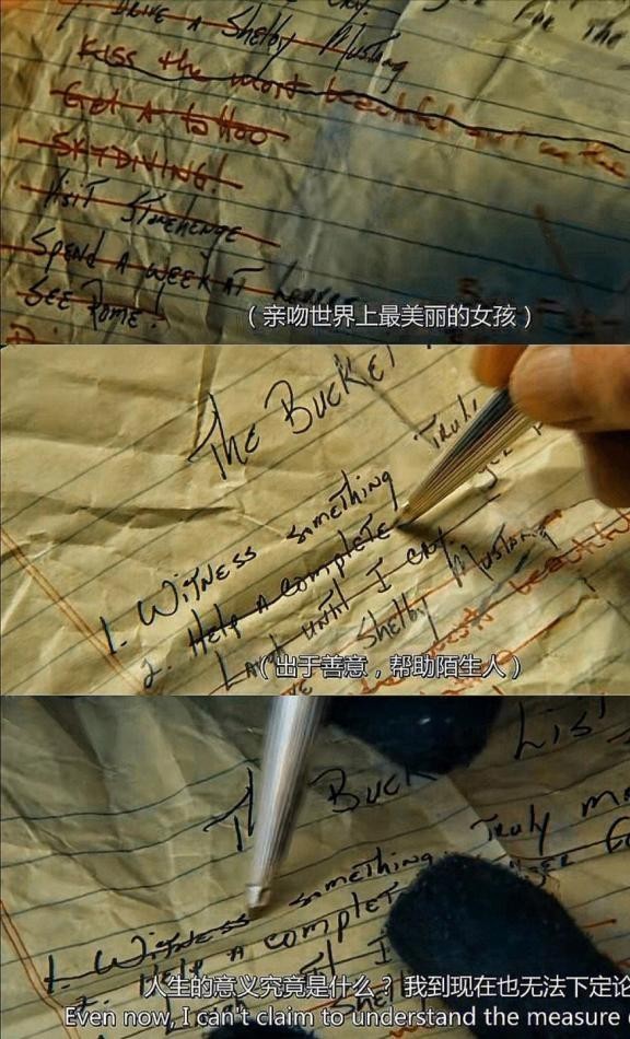 钱伯斯拿出他重新拼好的遗愿清单划掉“笑到流眼泪”,然后将这张清单交给富豪,说“剩下的愿望只能靠你了”。