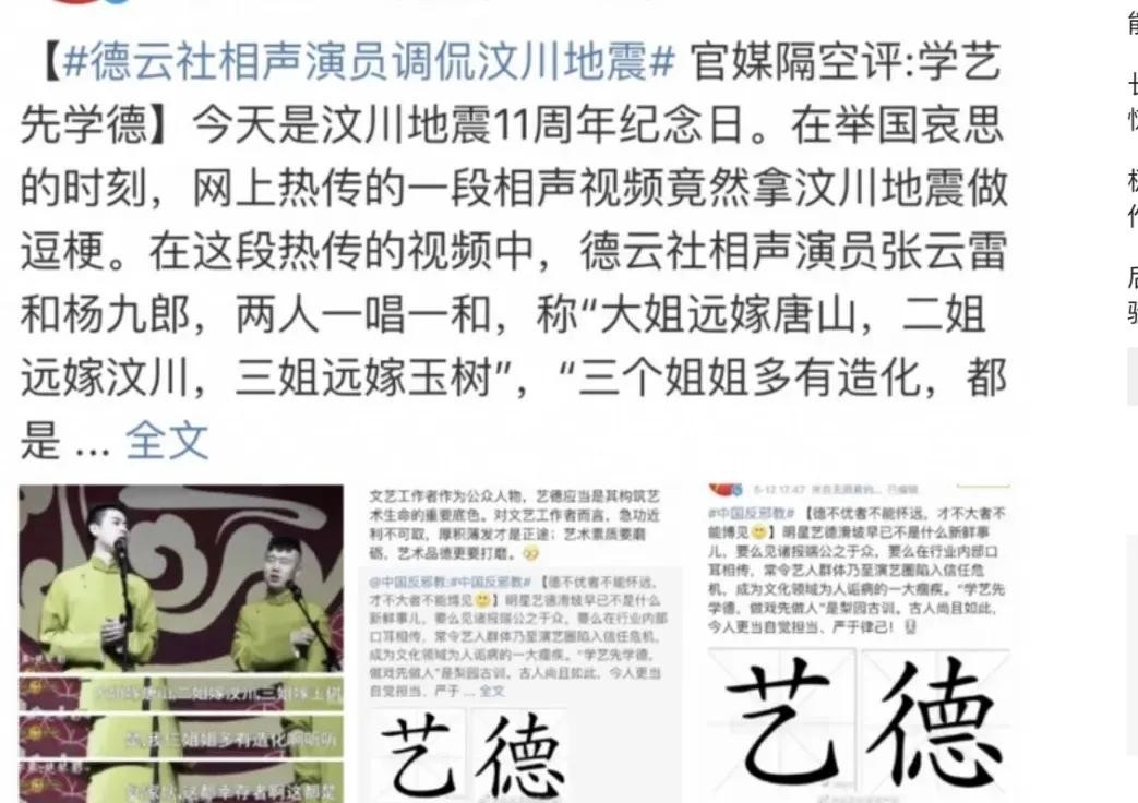 在汶川地震 11 周年这个特殊的日子,网上突然曝出他早年在一场相声演出里,居然拿汶川地震当逗乐的梗。他和搭档杨九郎在台上笑嘻嘻地说:“大姐嫁唐山,二姐嫁汶川,三姐嫁玉树。”还说“三个姐姐多有福气,都是幸存者。”这话一传开,网友们立马就炸了锅,大家气得不行,纷纷指责张云雷这是在拿国难开玩笑,太不尊重历史,太伤大家的心了。