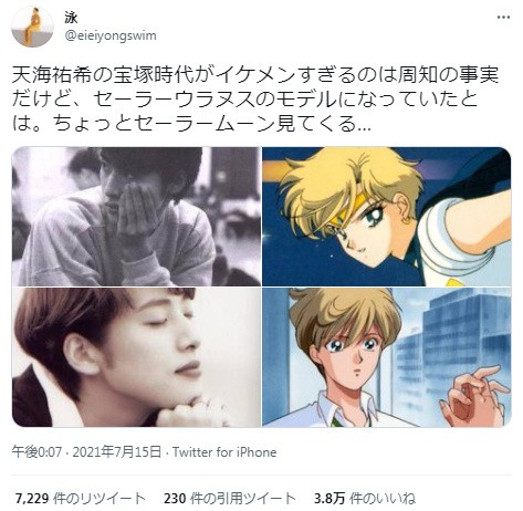 对比天海佑希短发形象,以及天王遥在动画中的表现,可以说两者几乎是完全一样的,相似之处高达99%。天王遥在动画故事剧情表现格外的温柔,是一个帅气风格的女孩子,却有着非常体贴的风格,甚至也让火野丽,爱野美奈子,月野兔她们脸红过,足以证明这个角色的魅力。