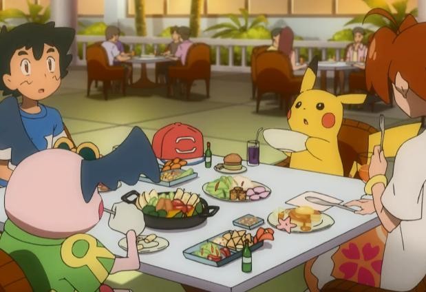 一样是在日月系列动画的第一集《阿罗拉!最初的岛屿和最初的宝可梦们》中,本集在小智和花子吃饭时,餐桌上摆放了汉堡和烤肠(而汉堡和烤肠的主要材料都有肉),而在动画首作之后,出现的食物基本上都是蔬菜、树果或是面类食品。