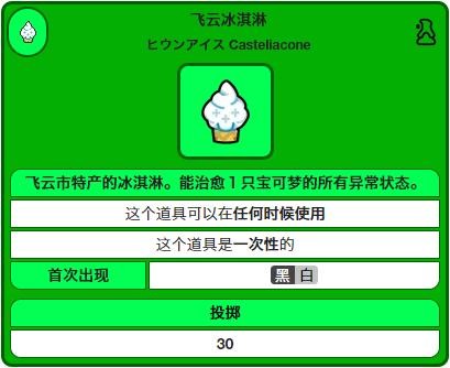 飞云冰淇淋是众多道具的其中一种,效果是选择自己队伍里一只宝可梦使用。解除该宝可梦的任何异常状态,飞云冰淇淋在游戏设定中是飞云市才有的知名特产,很多人慕名而来就为了尝一口飞云冰淇淋的味道,而飞云冰淇淋原型可能为哈根达斯,飞云市原型为布鲁克林,为著名冰淇淋品牌哈根达斯的发源地;在《黑2/白2》中,玩家可以一次性购入12个。