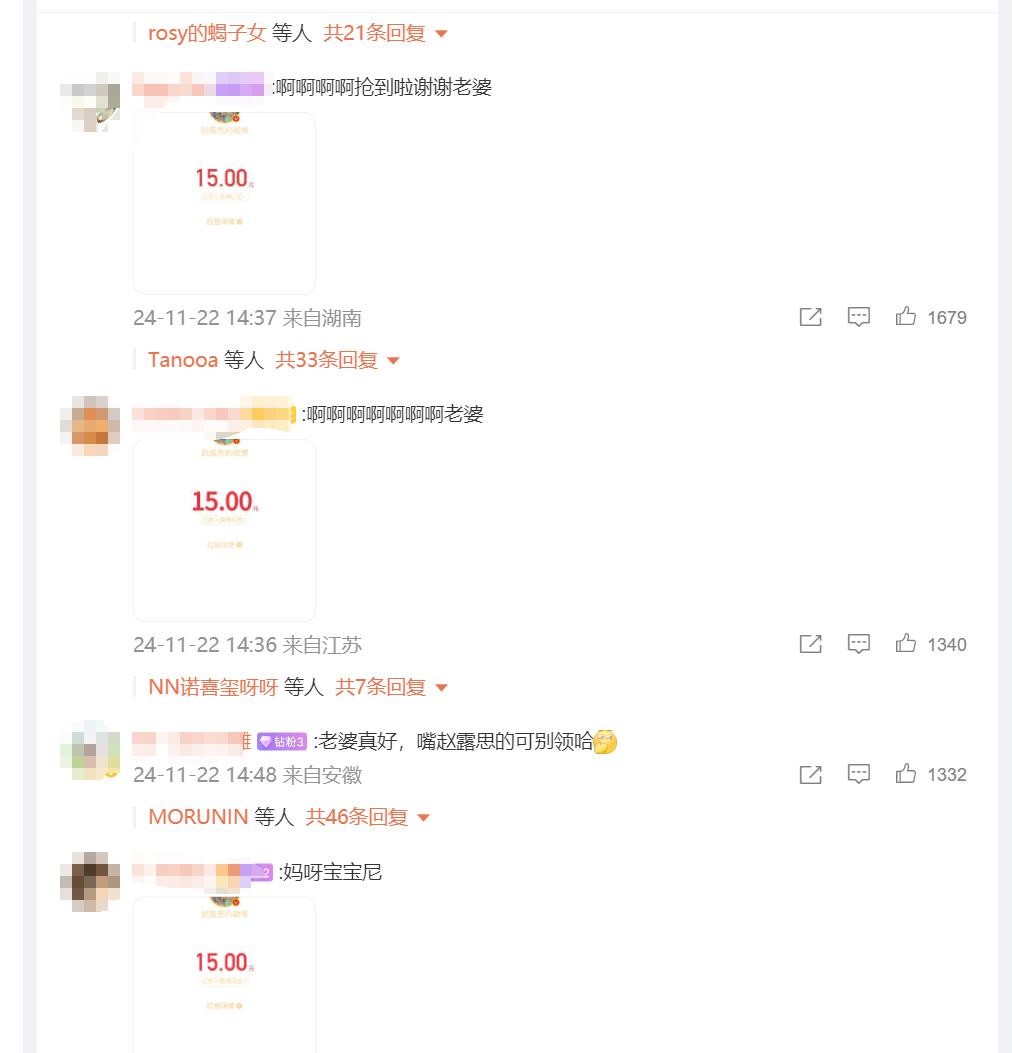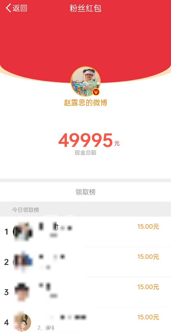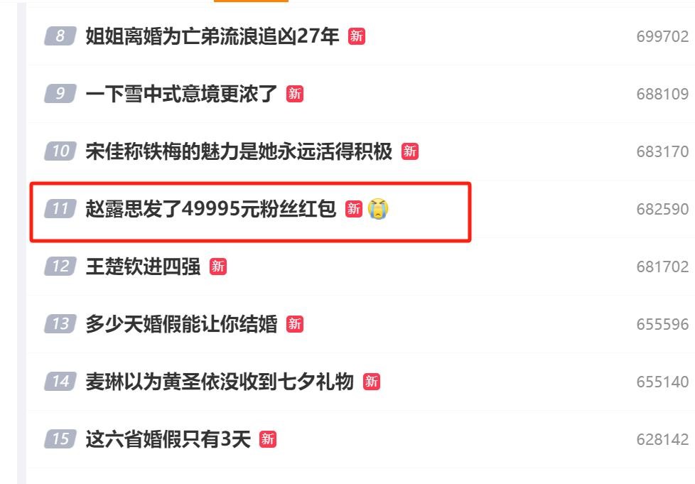 11月22日,她在微博发了一个大红包,微博词条#赵露思发了49995元粉丝红包#就登上了热搜了。粉丝们纷纷在评论区晒出了自己抢到的红包金额。