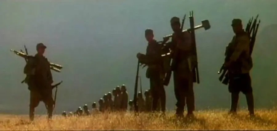 在受俘的前一晚,日本的军人望着天空的月亮,响起家乡的民谣,影片让我们看到了一个身为“人”的日军形象,他们因为战争所涌起的思乡之情与中国人一样是深沉且悲情的。