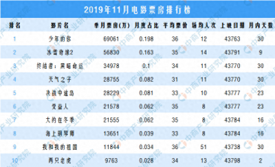 - 2019年11月国内电影票房排行榜:总票房超34亿元《少年的你》领衔