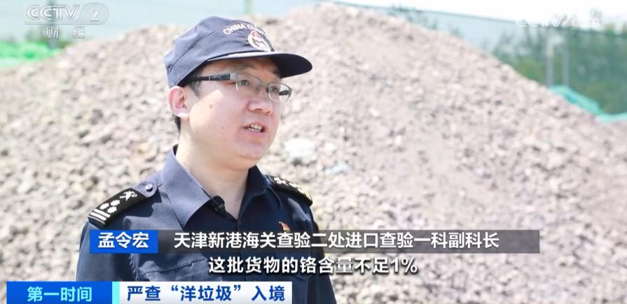 天津新港海关查验二处进口查验一科副科长 孟令宏:经取样送检,这批货物的铬含量不足 1%,正常铬矿的铬含量应该会达到 30% 以上。最终,我们判定这批货物为我国禁止进境的固体废物,也就是俗称的 " 洋垃圾 "。后续,我们将全程严密监管这批货物,按照 " 从哪来,到哪去 " 的原则,确保货物全部退运出境。
