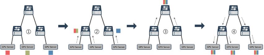 以集合通信中使用频率最高的 AllReduce 规约运算为例,从各节点收集梯度,将训练过程中的汇总规约卸载到集成了计算引擎单元的网络交换机中进行,然后再更新至每一个节点。通过在网计算技术,加速了整个 Allreduce 的过程,可以有效的减少网络拥塞和降低通信延迟。