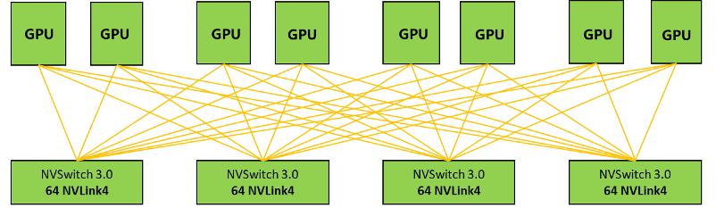 NVDIA 首创了 NVLink + NVSwitch 技术,为多 GPU 系统提供更加快速的互联解决方案。借助 NVIDIA NVLINK 技术,能最大化提升系统吞吐量,很好的解决了 GPU 互联瓶颈。最新的 NVIDIA Hopper 架构采用 NVLINK4.0 技术,总带宽最高可达 900GB/s。